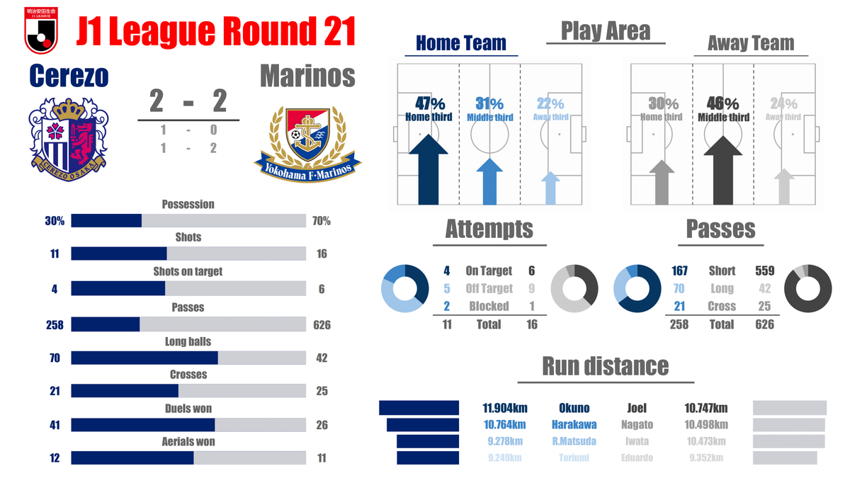 そのためセレッソは飲水タイム後から対応を変更。センターバックへ出るのは2トップ。サイドハーフは、マリノスのサイドバックをガッチリ捕まえるようになります。フォワードは元々ボランチ番というタスクもあるため、仕事量が増えることに。判断を問われる回数と走行距離が増えるので、消耗しやすくなります。攻撃に使うパワーを削ってでも、マリノスの攻撃による危険性を下げたかった。小菊監督の志向が垣間見えたように感じました。
